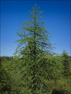 Eastern larches thrive out in the open. When exposed to full sun, as shown here, the larch will take on a pyramid-like shape. If the tree becomes crowded by competition, it will self-prune dramatically and become narrow. Photo credit Paul Smith’s VIC