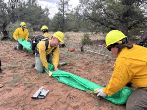 After a long Labor Day weekend full of rest, relaxation, and hot showers, the crews gathered back together for the last week of their formal onboarding: wildland fire chainsaw training. While many rural New Mexicans have some level of experience operating chainsaws to gather firewood, there’s a big difference between running a saw on private land for personal projects and operating one on a fire line to complete operational objectives. In a way, the crew members with no prior saw experience had an easier time as there was no pre-existing muscle memory or poor technique to overcome. Chainsaws are a powerful tool on the fireline, capable of downing hazardous trees, clearing brush, and bucking up burning logs into manageable lengths. With that utility, however, comes an inherent amount of risk; a misguided tree falling can easily damage personnel or vehicles, and an ounce of carelessness by the saw operator can result in an emergency evacuation. To combat this, heavy emphasis in training is placed on proper saw control, situational awareness, and backcountry medical care in the event of an incident. Crews practiced evacuating a victim from the forest on a team-carry litter and the complex logistics that exercise entails. By the end of the week, each crew member had demonstrated aptitude by assessing a tree’s hazards, creating a falling plan, and executing that plan to a safe completion.